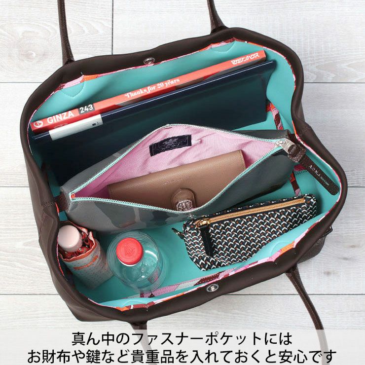 センターにファスナー付きポケットがあるので細かい物はそちらに収納できます。ポケットの外側に付いているスナップボタンで本体の口を留められます。