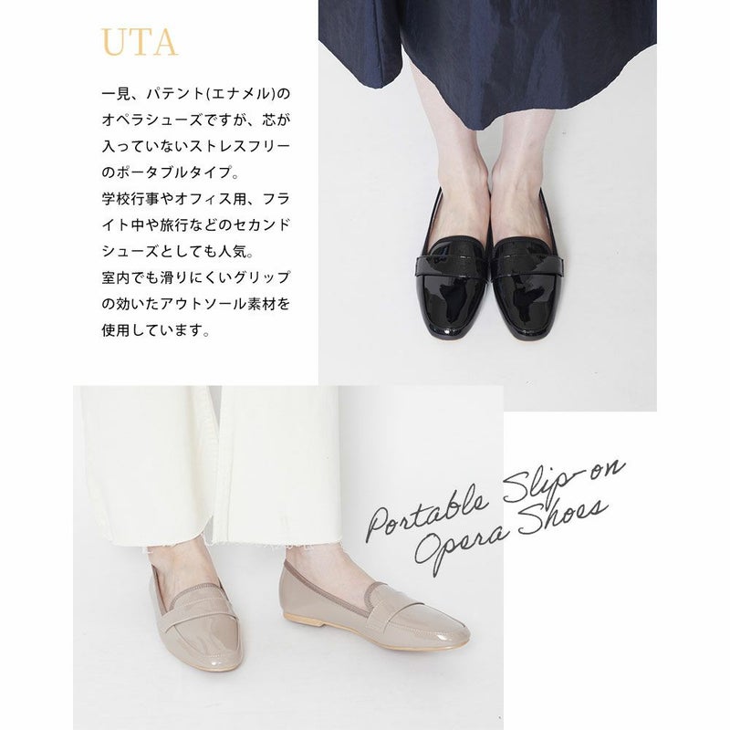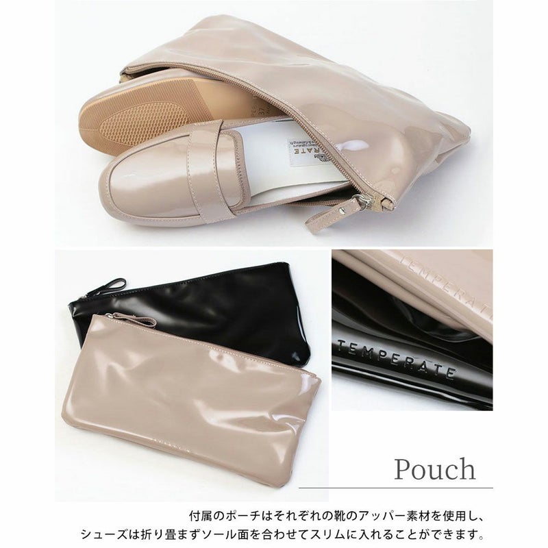 携帯性を実現するため、つま先とかかとには芯を入れておらず、付属のポーチへスリムに収納可能。お出かけ時の履き替えや、ドライブ、学校行事などに大活躍の一足です。