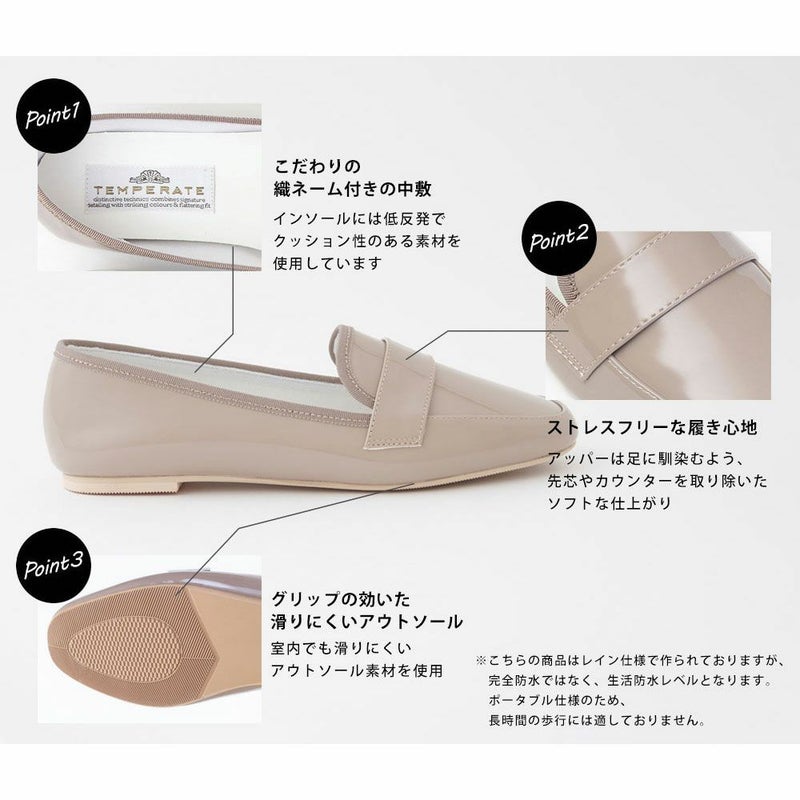ブランド名(TEMPERATE=控えめな)の通り、エレガントにもシャープにもカジュアルにも幅広いスタイルに合わせられる提案で、雨の日に頼れるだけでなくデイリーにも履いていただけます。