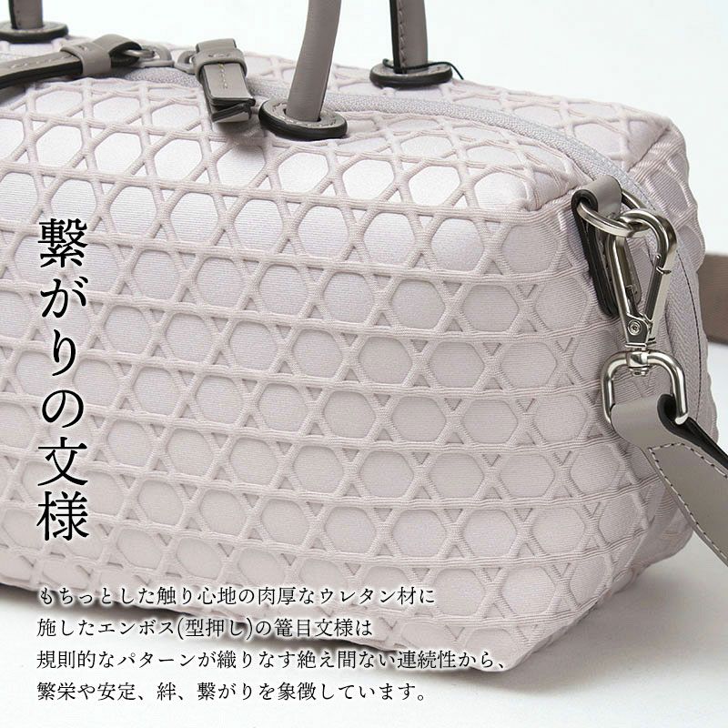 肉厚なウレタン材に施したエンボス(型押し)の篭目文様は規則的なパターンが織りなす絶え間ない連続性から、繁栄や安定、絆、繋がりを象徴しています。